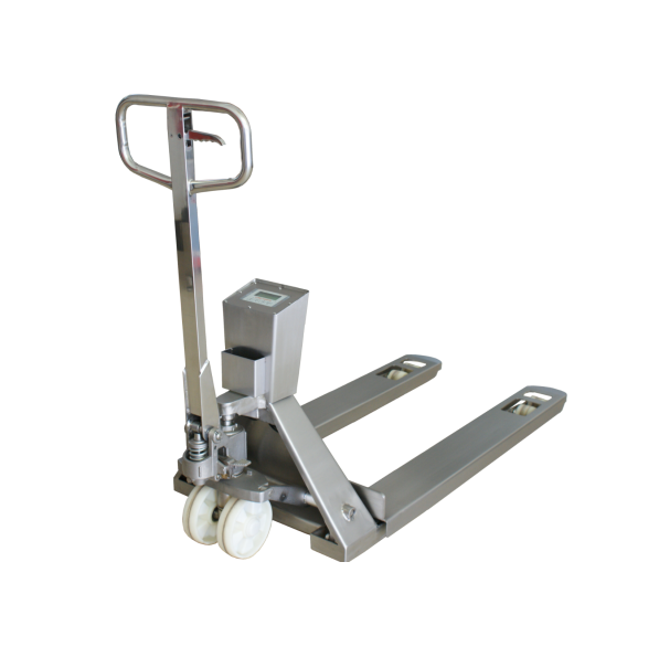 ★叉車秤由雙層不銹鋼秤體、尼龍移動輪、傳感器、接線盒,不銹鋼液壓缸,拖動手柄組成。